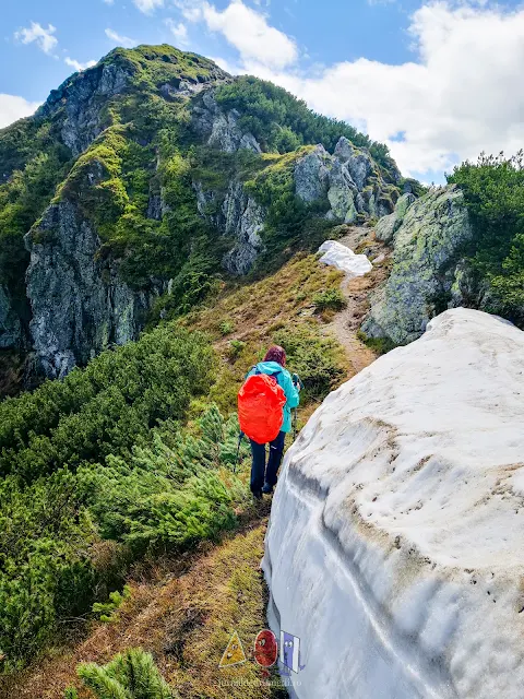 Poteca continuă printre jnepenii uzi de la ploaie, în câteva minute reușim să ne udam complet.
